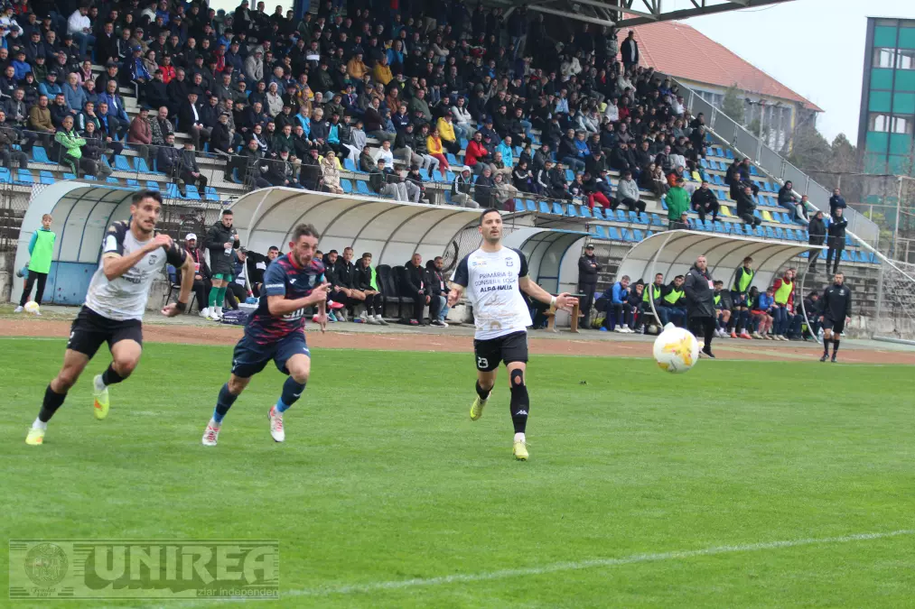 Un derby încrâncenat, disputat în fața unei tribune pline, aproximativ 800 de spectatori, a avut parte de un debut incendiar. „Alb-negrii”, cu o distribuție tactică modificată, au început extrem de deciși și au dominat startul de joc, punând presiune pe buturile adverse. Au fost ocaziile lui Giurgiu (a respins Berța) și Golda (4), Blănaru (7, intervenție a portarului advers) și bara lui Golda (11, șut deviat în transversală), până la deschiderea scorului, când același Golda (13) a punctat cu un șut din careu! Forcingul vizitatorilor s-a liniștit, iar P. Păcurar (30) – semnează primul șut pe poartă al gazdelor. Kiraly (34) – șut de la distanță deviat, a adus noi emoții la poarta albaiuliană. Vizitatorii îi pierd, din motive medicale, pe Câșlariu și Balaur, jocul echilibrându-se substanțial. Pelici mai mută și la pauză, cu încă două înlocuiri, și oaspeții își majorează avantajul, prin rezerva Giosu (51) reluare cu capul la centrarea lui Giurgiu. Este o singură echipă pe teren, iar Blănaru (53) marchează din centrul careului pentru un 0-3 naucitor! P. Pahone (69) a avut un șut extraordinar care a scuturat transversala! Abia intrat Banyoi (76) a înscris cu un șut în diagonală, după ce a pivotat în careul advers, ducând scorul la proporții drastice. Ștefan (86) a respins în lateral șutul trimis de Suciu! Ultima acțiune notabilă, încă o transversală a gazdelor (Liubashov 89), la un corner.
