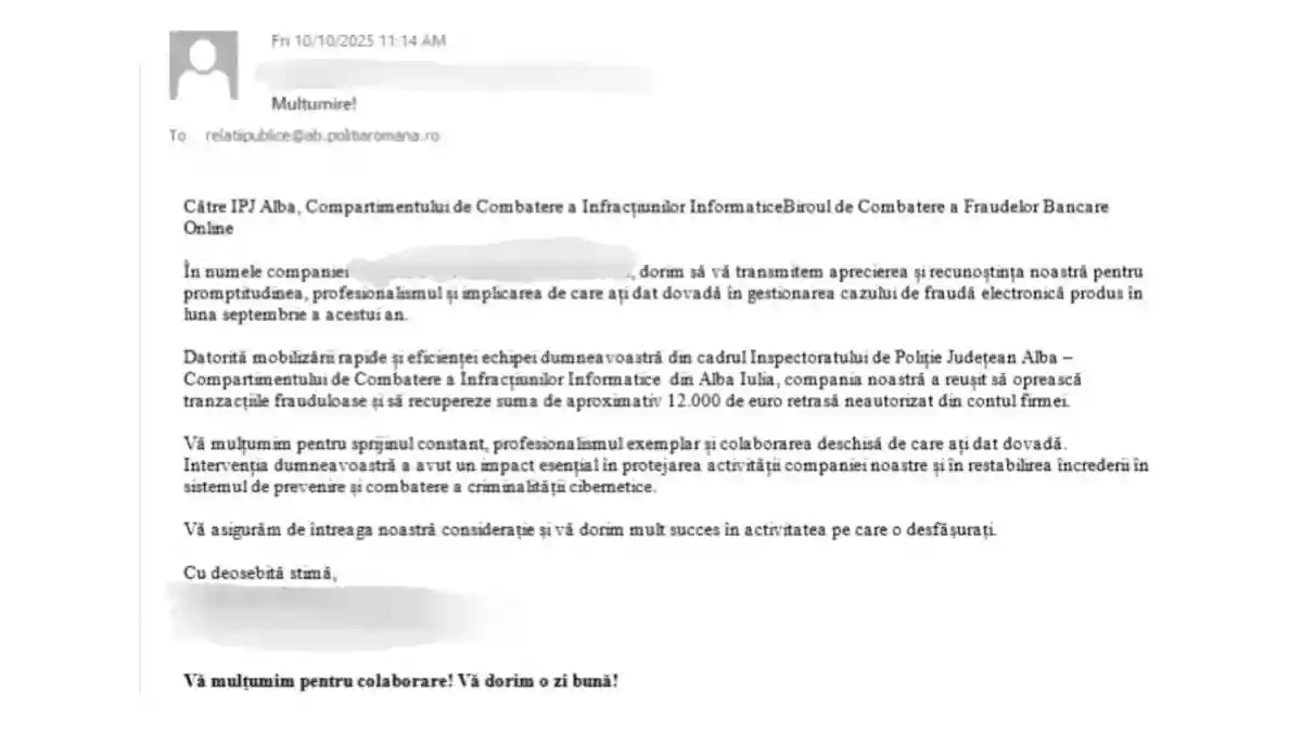 Datorită mobilizării rapide și eficienței echipei dumneavoastră din cadrul Inspectoratului de Poliție Județean Alba – Compartimentului de Combatere a Infracțiunilor Informatice din Alba Iulia, compania noastră a reușit să oprească tranzacțiile frauduloase și să recupereze suma de aproximativ 12.000 de euro retrasă neautorizat din contul firmei.