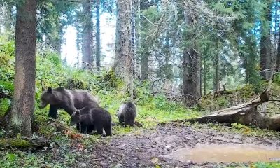 VIDEO | Imagini inedite cu o ursoaică și trei pui, în Parcul Natural Apuseni. Grupa mică la plimbare, surprinsă de camerele de monitorizare a faunei sălbatice