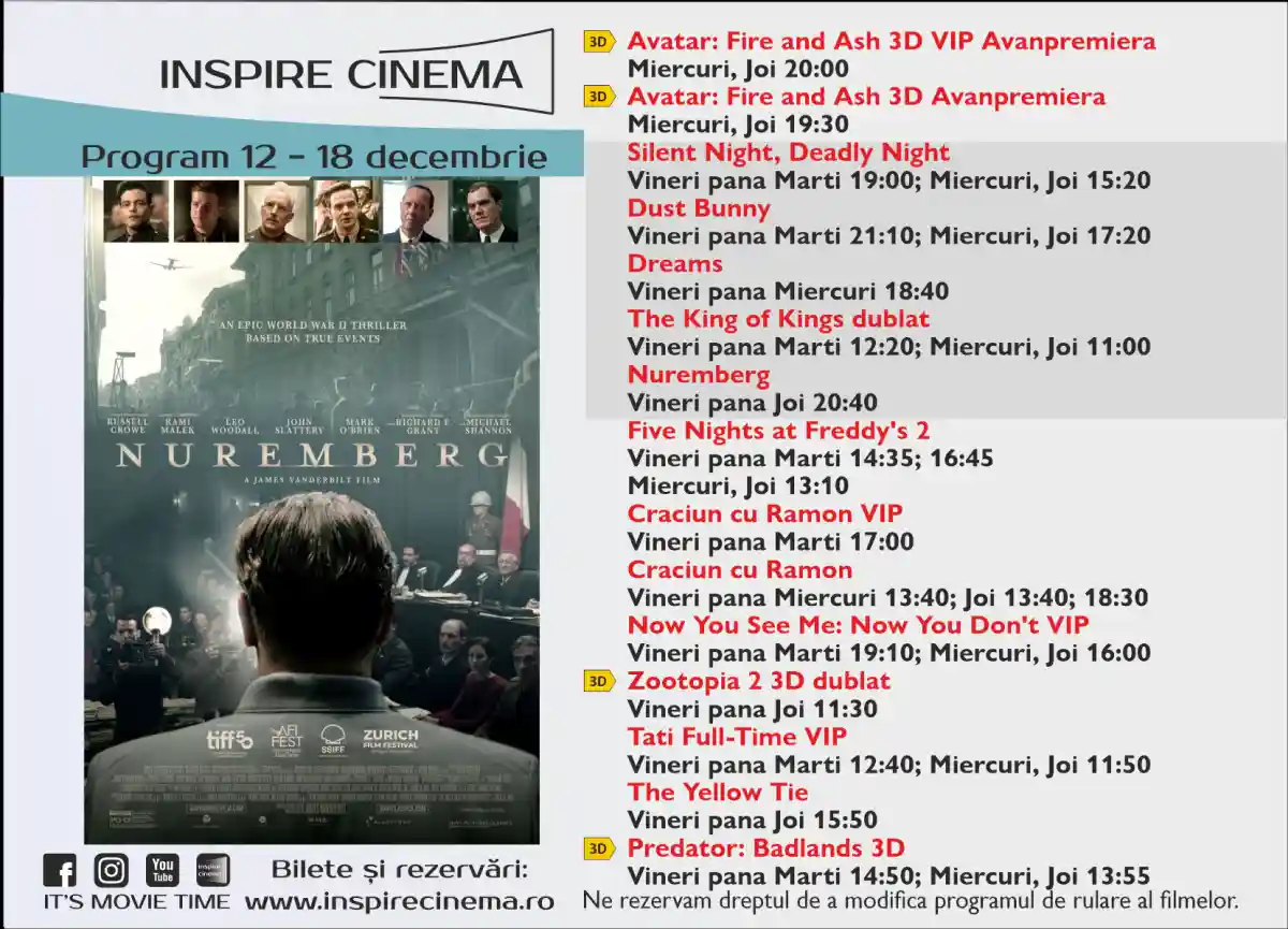 Programul Inspire Cinema Alba Iulia, pentru perioada 5 – 11 decembrie 2025. Ce filme vor rula la cinematograful din centrul comercial Alba Mall Nuremberg Avanpremiera Regia: James Vanderbilt Cu: Rami Malek, Russell Crowe, Michael Shannon, Leo Woodall, Colin Hanks Gen Film: Drama, Istoric, Thriller Durată: 148 min Rating: N 15 După încheierea celui de-al Doilea […]
