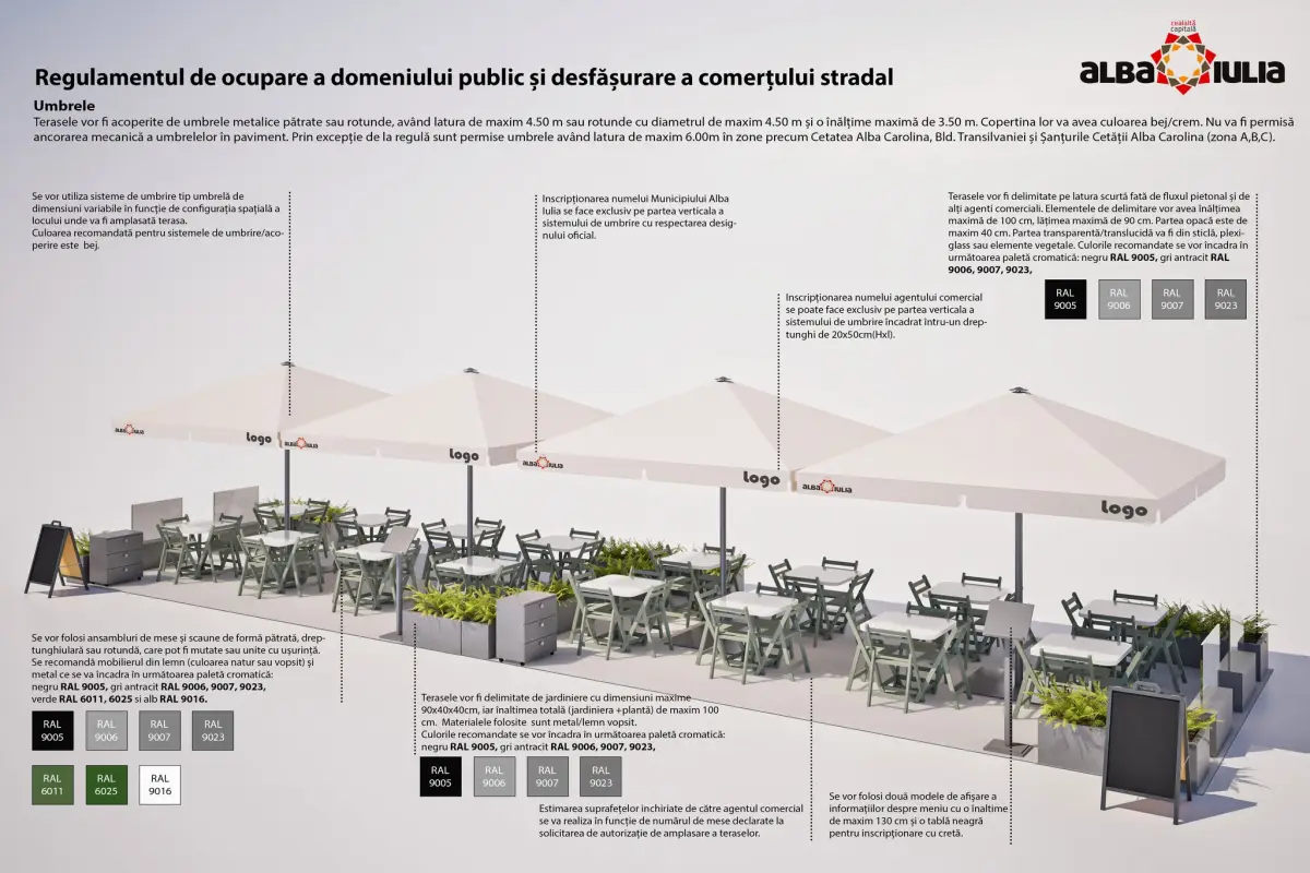 Pentru o mai bună informare, atașăm și anexele regulamentului de ocupare a domeniului public, astfel încât toată lumea să poată vedea modul de amenajare recomandat pentru amenajarea teraselor.