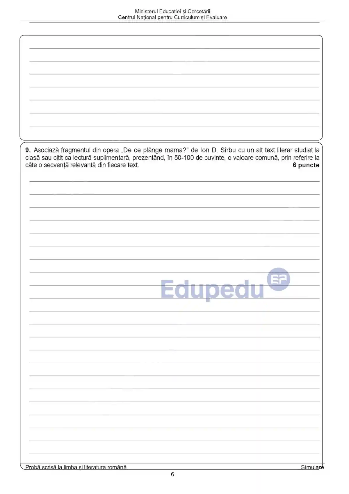 Punctul 9 le cere candidaților să asocieze fragmentul din opera „De ce plânge mama?” de Ion D. Sîrbu cu un alt text literar studiat la clasă sau citit ca lectură suplimentară, prezentând, în 50-100 de cuvinte, o valoare comună, prin referire la câte o secvență relevantă din fiecare text.