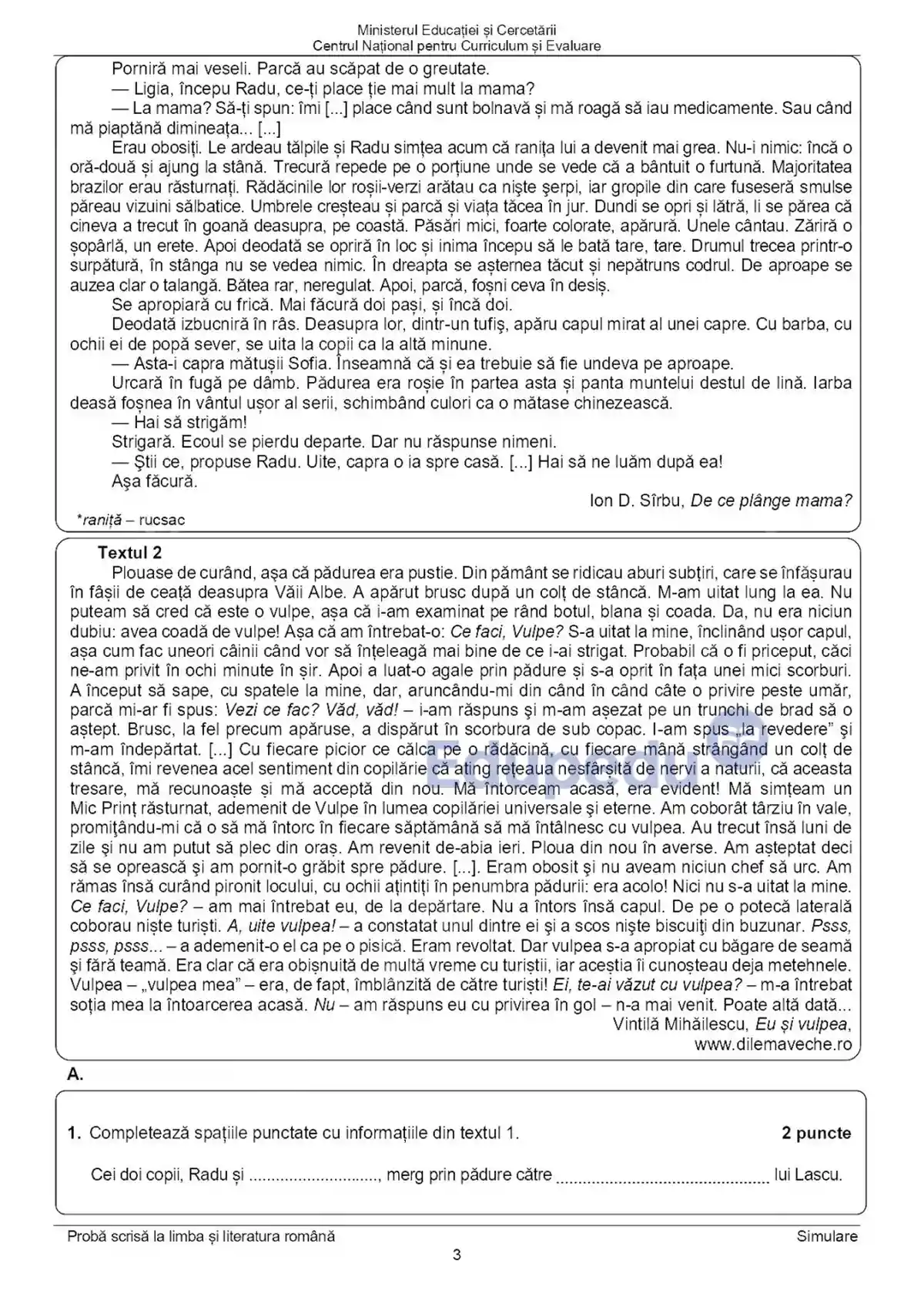Elevii de clasa a VIII-a au primit două texte la prima vedere la simularea probei de Limba și literatura română de la Evaluarea Națională 2026, potrivit subiectelor consultate de Edupedu.ro. Primul text este un fragment din opera „De ce plânge mama?” de Ion D. Sîrbu, iar al doilea este un articol scris de Vintilă Mihăilescu, „Eu și vulpea”, publicat în Dilema veche.
