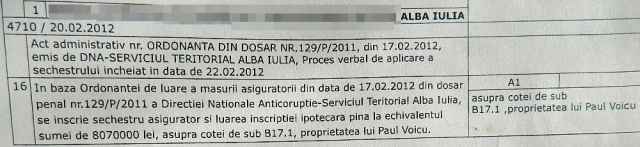 Au intrat în posesia noastră mai multe extrase de CF-uri (Carte Funciară) din care rezultă acest lucru. De exemplu, conform copiei prezentate în imagine din extrasul de CF Colectivă NR. 70088, Alba Iulia, provenit din conversia de pe hârtia CF Nr. 38529, rezultă că în temeiul Ordonanţei nr.129-P-2011 a DNA-Serviciul Teritorial Alba Iulia s-a instituit sechestru asigurator asupra proprietăţii lui Paul Voicu.