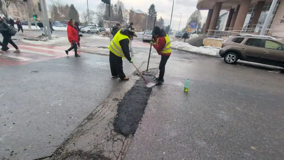 Mai mulți muncitori astupau de zor gropile din asfalt.