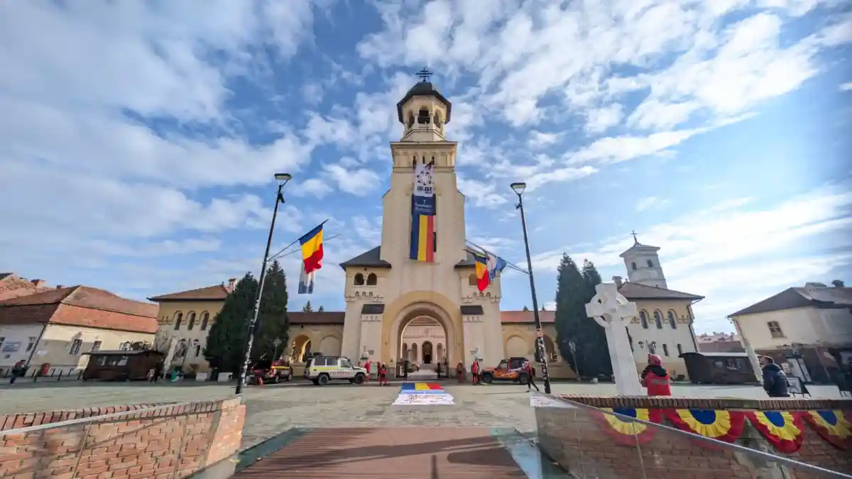 Steagul de mari dimensiuni a fost amplasat pe turnul Catedralei de către Salvamont Alba, unde va rămâne până după data de 1 Decembrie 2025, pentru a marca Ziua Națională a României.