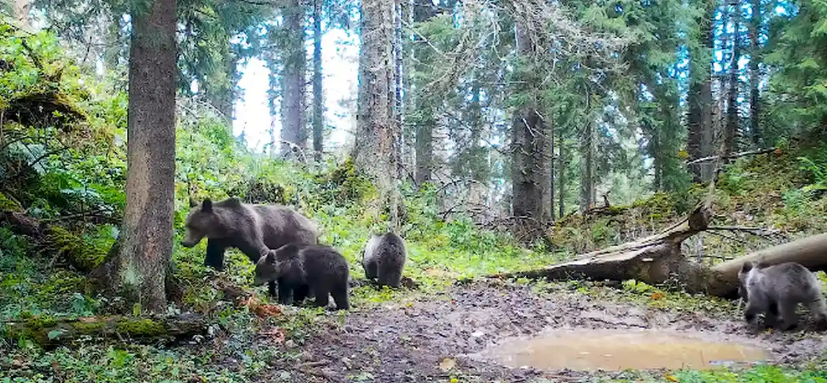Grupa mică sau mai exact o ursoaică cu trei pui a fost surprinsă în pădurile Parcului Natural Apuseni, fiind filmați de camerele de monitorizare a faunei instalate de specialiștii din cadrul administrației parcului natural.
