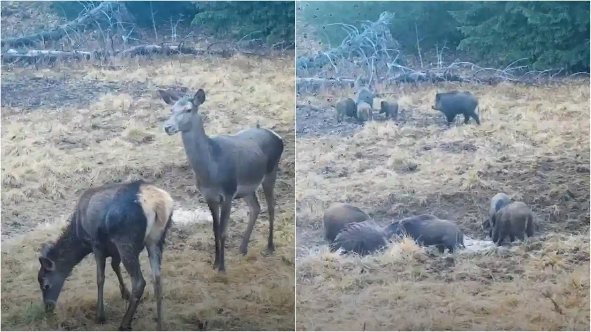 Imagini INEDITE surprinse în Parcul Natural Apuseni: Card de ciute cu viței și mistreți la ora de jogging, filmați în luminișul dintr-o pădure