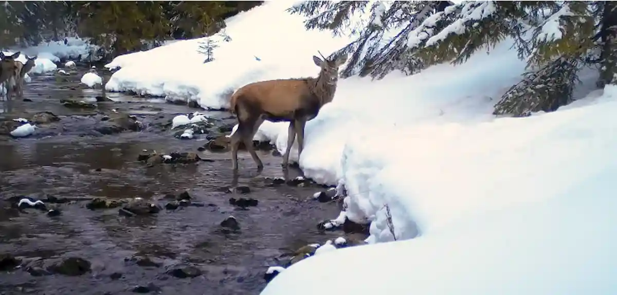 VIDEO | Imagini SPECTACULOASE în Parcul Natural Apuseni: Cârd de ciute, viței și cerbi tineri, surprins la sfârșit de februarie în zona unui râu de munte