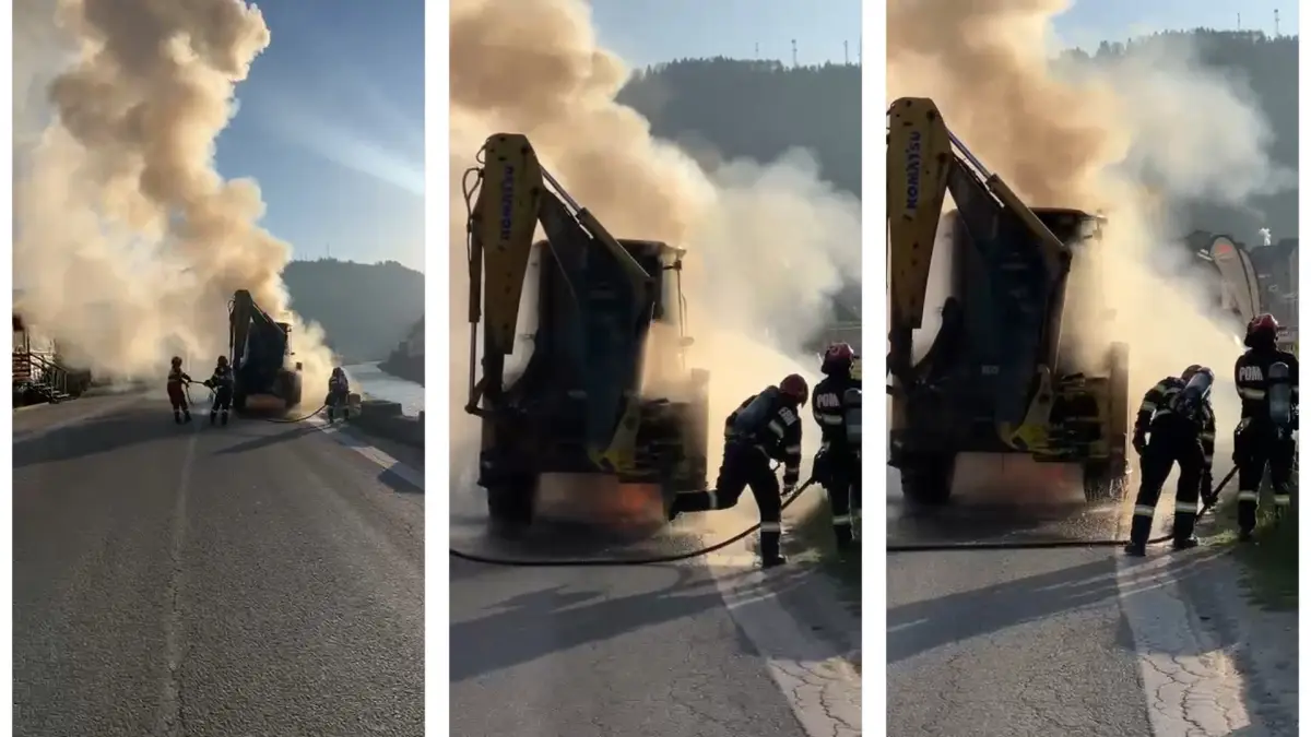 VIDEO | INCENDIU la Câmpeni: Tractor în flăcări pe DN 75. Intervin pompierii