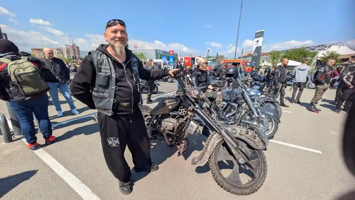 Ovidiu Kiss, un bărbat din Alba-Iulia, motociclist și, bineînțeles, rocker adevărat, a fost sâmbătă, 18 aprilie 2026, la deschiderea sezonului moto din Alba, cu o motocicletă construită de el, la scară naturală, din piese din dezmembrări.