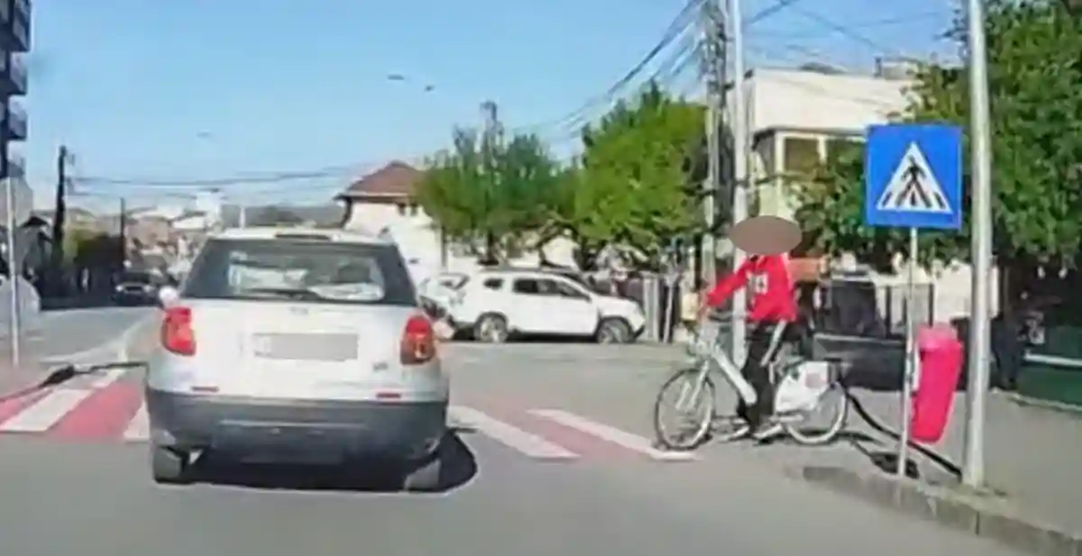 Camera de bord a unui autoturism a surprins momentul în care un biciclist traversează strada neregulamentar, pe o trecere de pietoni din Alba Iulia.