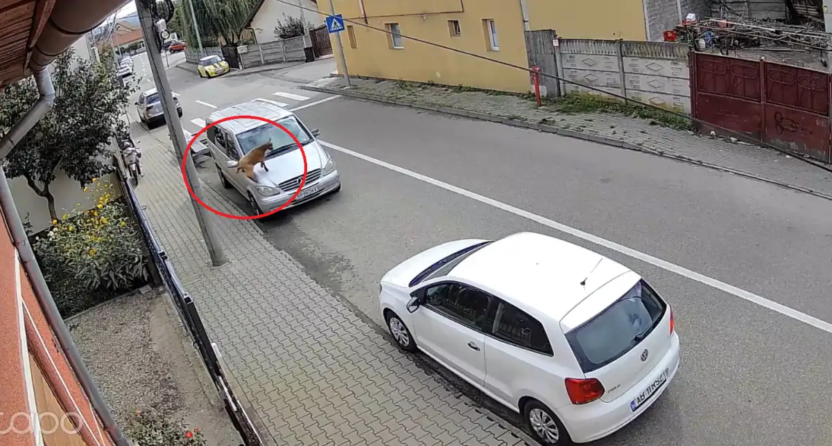 Pe străzile din Alba Iulia, imaginile de supraveghere a unei camere video au surprins un spectacol neașteptat! O capră liberă a decis să-și facă de cap prin oraș, culminând cu un moment memorabil: nu doar că a traversat strada cum a vrut ea, dar s-a a si sărit pe capota unui Mercedes gri parcat.