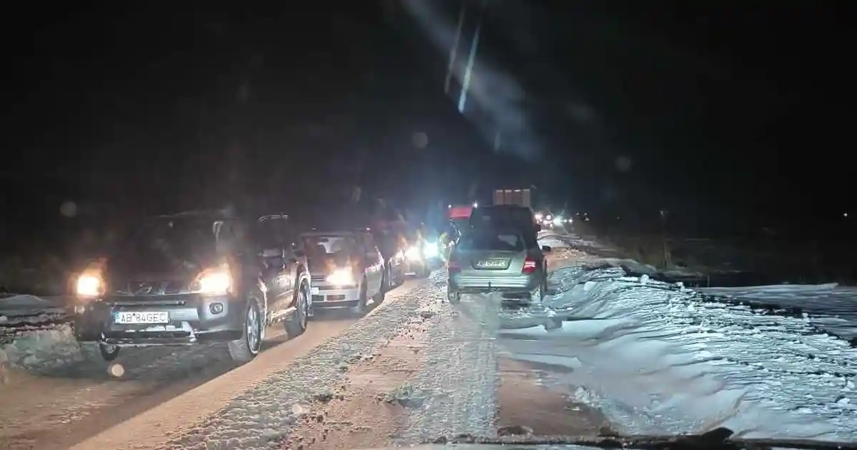 Mașinile nu au mai putut înainta pe drumul înzăpezit, iar nervii participanților la trafic au fost serios puși la încercare în cele peste 2 ore cât au avut de așteptat în coloană.